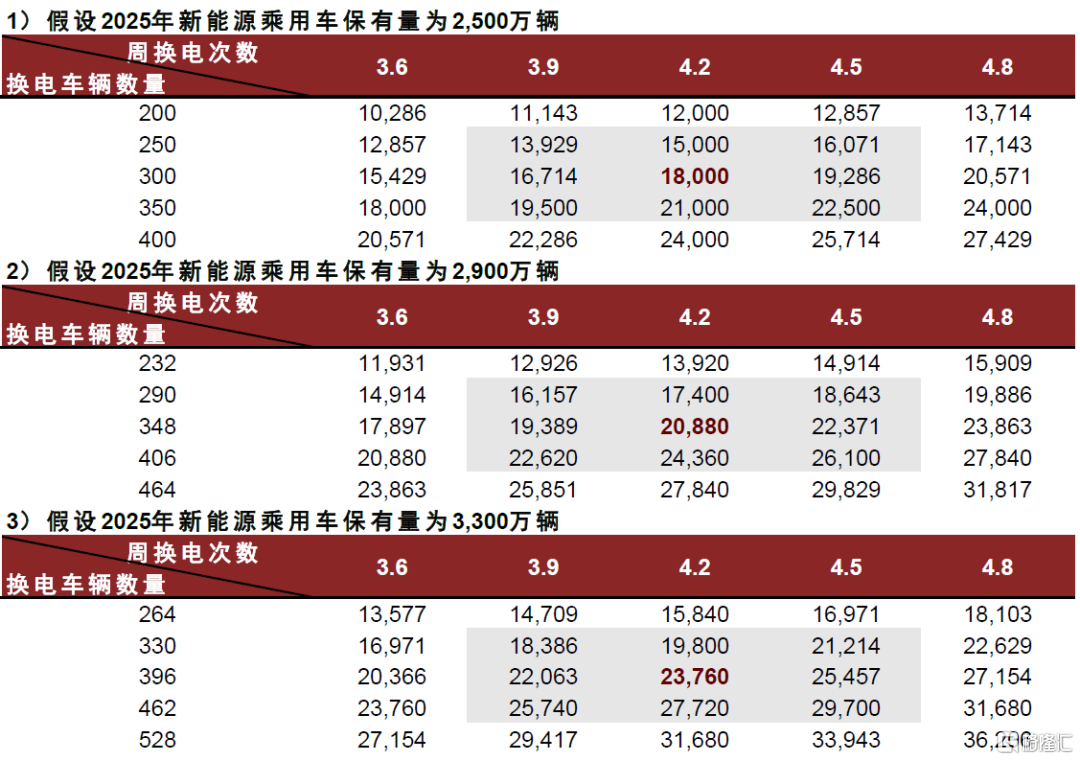 中性预测下,我们假设:1)2025年新能源乘用车保有量约2,900万辆,12%为换电车型,对应保有量约348万辆;2)车主平均每周换电4.2次;3)单座换电站使用频率为100次/天。则中性预期2025年换电站稳态需求量为2.1万座。