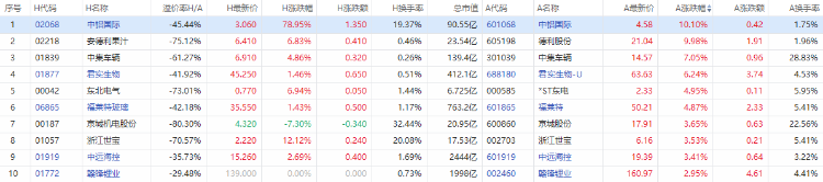 截至发稿,中铝国际A股涨停,H股涨78.95%;安德利果汁A股涨停,H股涨6.83%;中集车辆A股涨7.05%,H股涨4.86%。