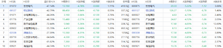 东方电气A股跌5.22%,H股涨4.78%;昭衍新药A股跌5.10%,H股跌0.84%。