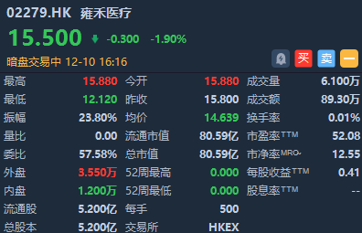 华盛资讯12月10日讯,植发医疗机构雍禾医疗 $02279.HK 暗盘现跌1.90%,最新总市值超80亿港元。该股预计将于下周一(12.13)正式上市。