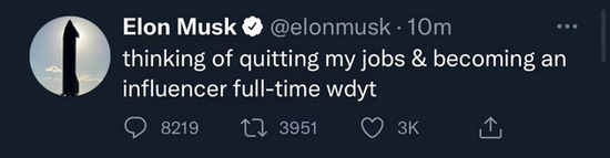 马斯克表示考虑辞职去当全职网红,再度抛售特斯拉 $TSLA 股票