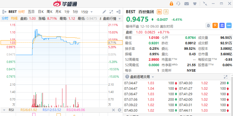 美股盘前,百世集团一度大涨18%,现涨幅收窄至8.71%。12月10日,企查查APP显示,近日,百世物流关联公司杭州百世网络技术有限公司发生工商变更,原股东何莉莉、陈微等退出股东行列,新增股东极兔速递有限公司,持股100%。企查查信息显示,该公司成立于2007年,法定代表人为樊苏洲,注册资本1377.98万元。10月29日,上海 J&T极兔速递和百世集团共同宣布达成战略合作意向,极兔速递将以约68亿元(合11亿美元)的价格收购百世集团中国快递业务。