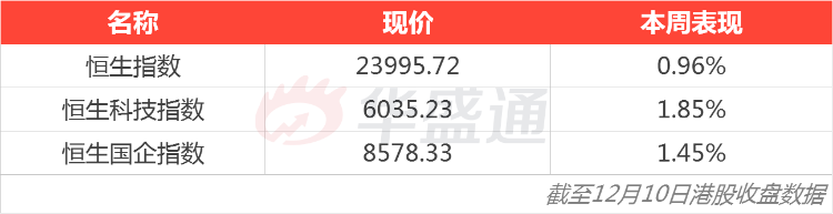 恒生指数本周涨0.96%,报23995.72点;恒生科技指数本周涨1.85%,报6035.23点;国企指数本周涨1.45%,报8578.33点。