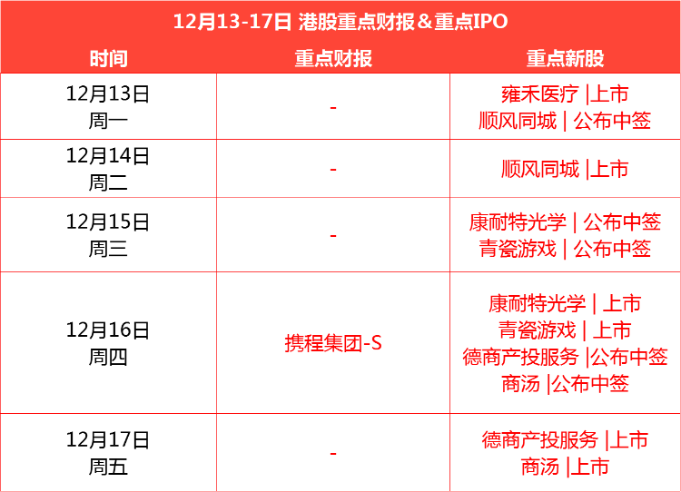 财报方面,下周重点财报为周四的携程集团-S;新股方面,下周预计有6只新股上市,分别是雍禾医疗、顺丰同城、康耐特光学、青瓷游戏、德商产投服务和商汤-W。