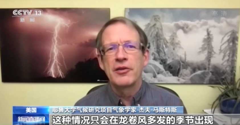 耶鲁大学气候研究项目气象学家 杰夫·马斯特斯:我看到雷达的时候就说,等一下,现在是12月,12月怎么会发生这种事?这种情况只会在龙卷风多发的季节出现,比如3月、4月、5月。我从来没在这个时候见过这样的情况。龙卷风的强度以及袭击(重灾区)梅菲尔德的主要的龙卷风,其路径长达200英里(约合322公里),我从来没见过这样的情况。