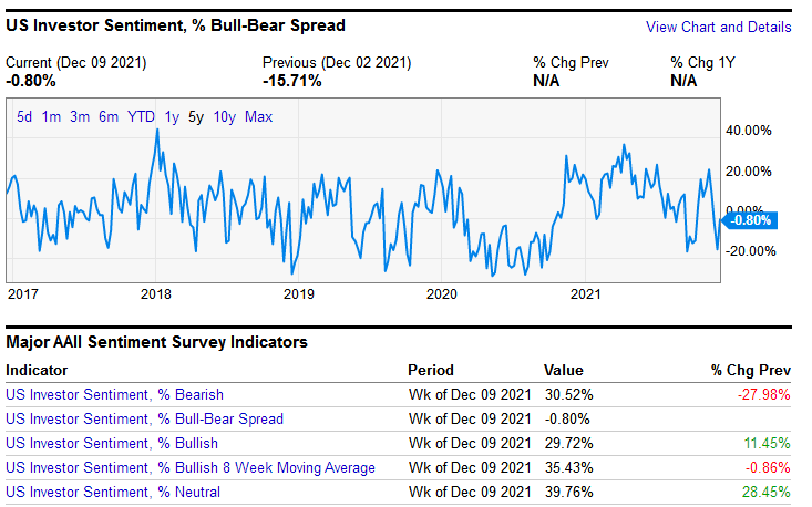 过去一周个人投资者对于市场的热情有所升温,第一财经此前曾报道,12月初美股陷入调整时散户积极入场抄底,超过26亿美元流入纳斯达克100指数ETF,如今这份勇气得到了回报。美国个人投资者协会(AAII)统计显示,截至9日当周看空后市的比例骤降近28%,情绪指数从9月低点回到中性水平。
