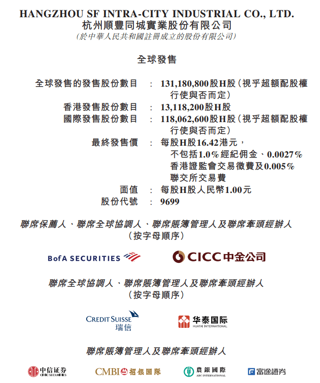 12月13日消息,顺丰同城(09699)发布公告,拟发行约1.31亿股,发售价已确定为每股H股16.42港元,全球发售收取的所得款项净额估计约为20.313亿港元。每手200股,预期H股将于2021年12月14日上市。
