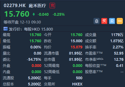 华盛资讯12月13日讯,植发医疗机构雍禾医疗 $02279.HK 首挂低开0.25%,盘前成交额1.873亿港元,最新总市值81.95亿港元,此前暗盘收跌3.54%。