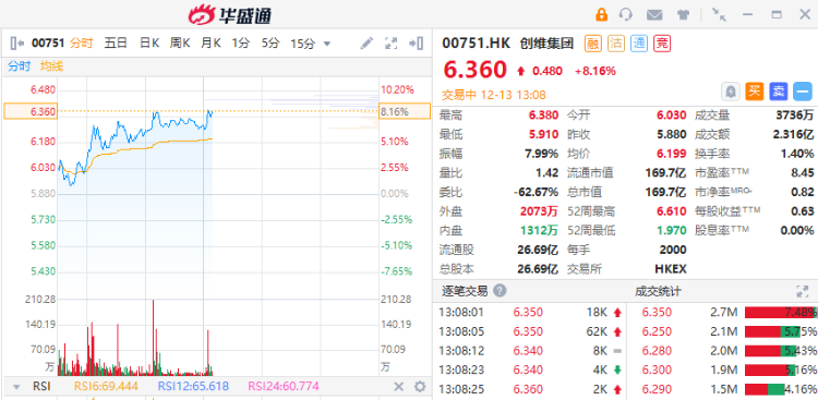 华盛资讯12月13日消息,创维集团(0751.HK)大幅拉升涨8.16%,报6.36港元逼近阶段高价,总市值169.7亿港元。