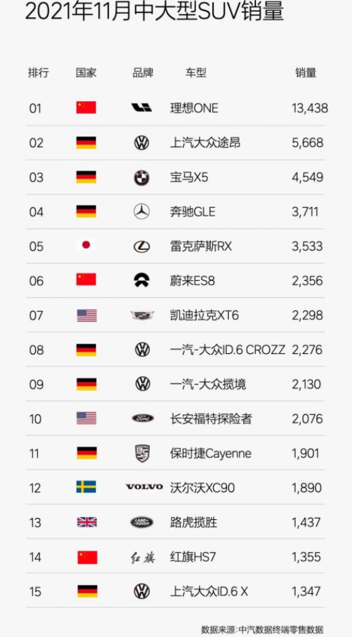 - 理想ONE于11月中大型SUV销量排行中位列第一