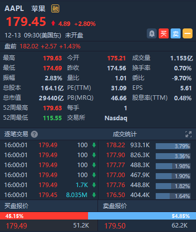 截至发稿,苹果盘前涨1.43%。苹果 $AAPL 上周五收盘报179.45美元,总市值为29441亿美元。今日开盘总市值有望历史性突破3万亿美元。