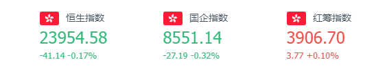 恒生指数周一高开低走,跌0.17%或41.14点,报23954.58点,全日成交额1296.92亿港元。国企指数跌0.32%,报8551.14点;恒生科技指数跌0.22%,报6022.23点。