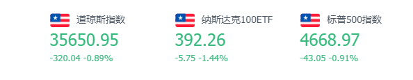 美股三大指数周一齐跌,道指跌320.04点,跌幅为0.89%,报35650.95点;纳指跌217.32点,跌幅为1.39%,报15413.28点;标普500指数跌43.05点,跌幅为0.91%,报4668.97点。