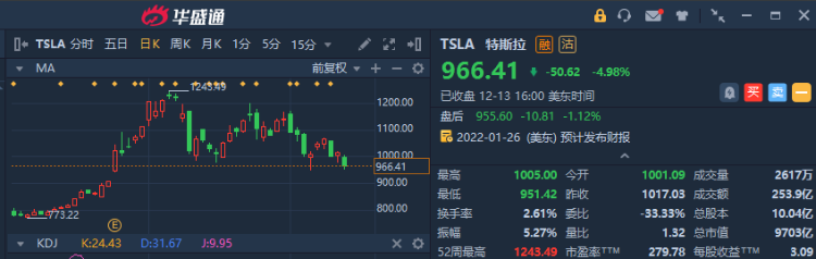 特斯拉昨日大跌5%,市值蒸发3200亿人民币,创10月22日以来新低,市值跌破1万亿美元。与11月初历史高位相比,特斯拉股价已下跌了逾21%。