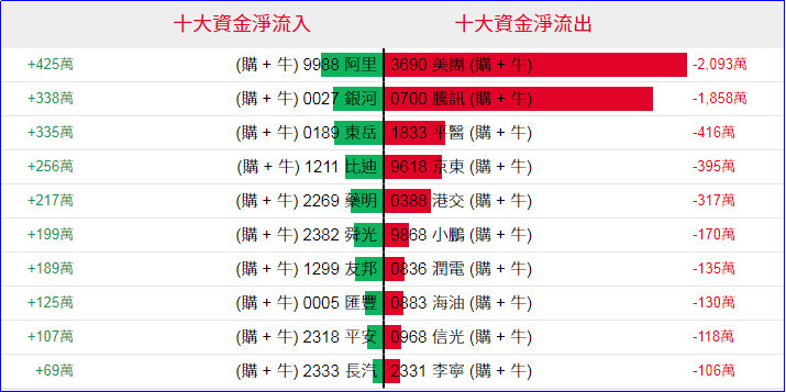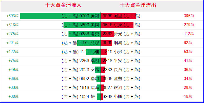 好仓(认购证及牛证)方面,周一阿里巴巴、银河娱乐、东岳集团相关好仓获部分资金净流入部署;美团、腾讯相关好仓则分别约2093万、1858万港元资金净流出套现,平安好医生、京东集团、港交所相关好仓也见资金净流出。