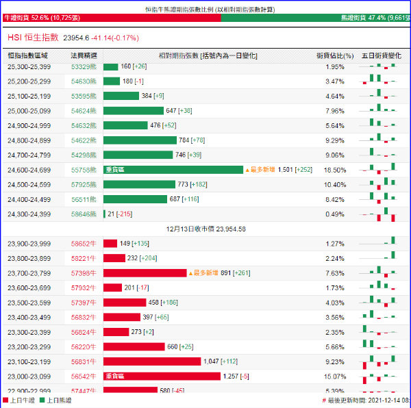 街货分布方面,至周一,恒指牛证街货在收回价23000点至23800点之间,相当约5184张期指合约;恒指熊证街货主要在收回价24300点至25100点之间,累计相当约5635张期指合约。