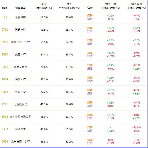 周一恒指相关权证的平均引伸波幅报约20.4%,按日小幅调升。个股方面,腾讯控股、阿里巴巴、美团、快手、中国平安等相关认购证的引伸波幅均按日上升;阿里巴巴、美团、快手、金沙中国、京东集团等相关认沽证的引伸波幅则见明显下调。