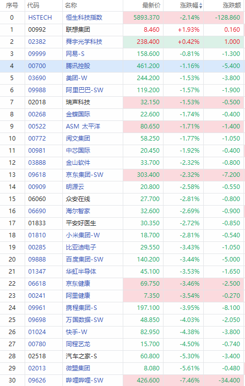 成分股多数走跌,惟联想集团、舜宇光学科技逆市微涨。截至发稿,哔哩哔哩跌超7%,汽车之家、微盟集团跌超5%,快手跌超4%,京东健康、阿里健康跌超3%,小米、京东等跌超2%。