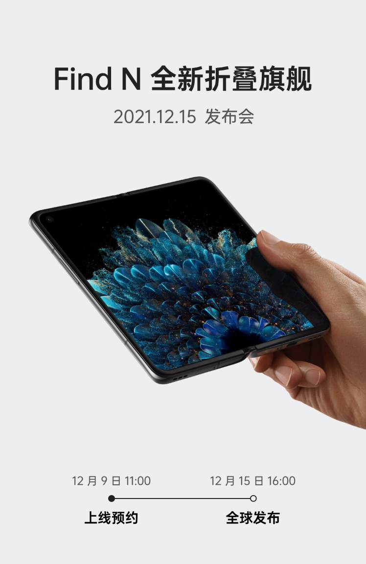 OPPO 旗下首款折叠屏手机 OPPO Find N 已经正式官宣,将于 12 月 15 日发布。