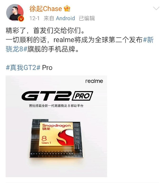 之前 realme 的高管徐起就表示,不会争抢高通骁龙 8 Gen1 的首发,而是去做全球第二个发布的品牌。