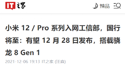本月月初,高通举行了 2021 年骁龙技术峰会,会上小米就表示要首发骁龙 8Gen1,之后就有微博博主爆料, 小米 12 的发布会预计在 12 月 28 日召开。