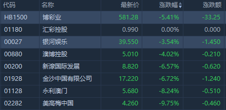 华盛资讯12月14日讯,港股博彩股多数下跌,美高梅中国跌9.75%,永利澳门跌8.24%,金沙中国跌6.72%,新濠国际发展跌6.57%,澳博控股跌4.02%,银河娱乐跌3.54%。