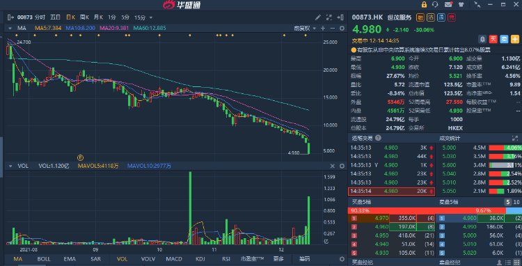 华盛资讯12月14日讯,世茂服务(00873.HK)大跌30.06%,世茂集团(00813.HK)跌超14%。世茂股份拟将所属的物业管理业务相关公司、资产、负债和业务全部出售给关联方世茂服务。