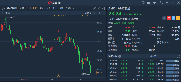 华盛资讯12月14日消息,今日美股盘前,AMC院线(AMC)跌超4%,该股昨日收跌逾15%,创今年5月以来新低。此前,该公司首席执行官及首席财务长共出售1020万美元AMC股票。