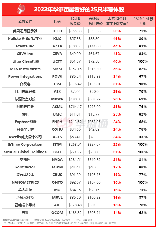 上图是华尔街在2022年最看好的25只半导体股名单。今年以来,受供应紧张及涨价等因素影响,多家半导体公司赚得盆满钵满,带动股价连连走高。其中备受关注的英伟达,今年来累计涨幅已达115.98%(截至本周一收盘)。