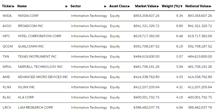 SOXX前十大成份股如下图(截至12月13日),其中英伟达权重高达9.34%: