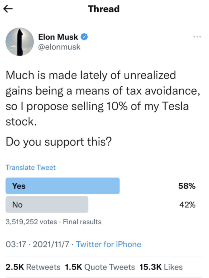 于是,马斯克11月7日在推特上发起投票,就是否出售10%特斯拉股票询问粉丝意见。结果显示,58%的网友支持其出售股票。