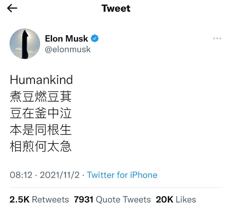 最著名的就是“七步诗”。11月2日,在马斯克个人财富增至3000亿美元后,联合国世界粮食计划署官员呼吁其捐款,以拯救陷入饥饿的人们。随后马斯克即在推特上用中文发布了曹植的七步诗:煮豆燃豆萁,豆在釜中泣。本是同根生,相煎何太急。