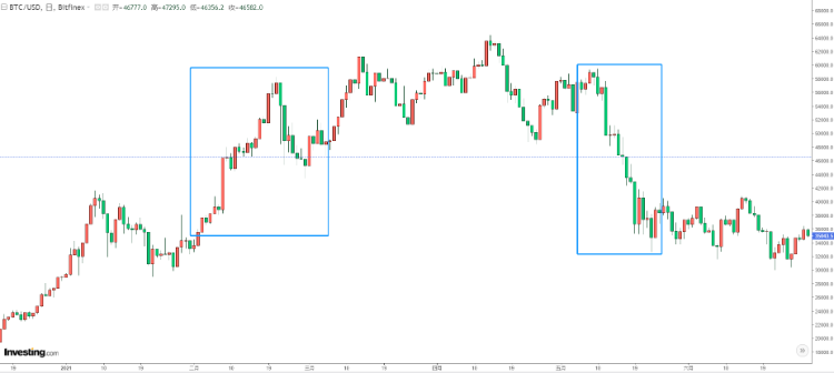 今年2月,特斯拉宣布购买价值15亿美元的比特币。3月,马斯克又宣布特斯拉接受比特币支付。这直接导致了今年一季度比特币的暴涨行情,彼时比特币价格从不到4万美元逐步飙升至超过6万美元。但在5月后,马斯克又宣布因比特币挖矿污染能源停止接受比特币支付,随后比特币又跌回3万美元附近。