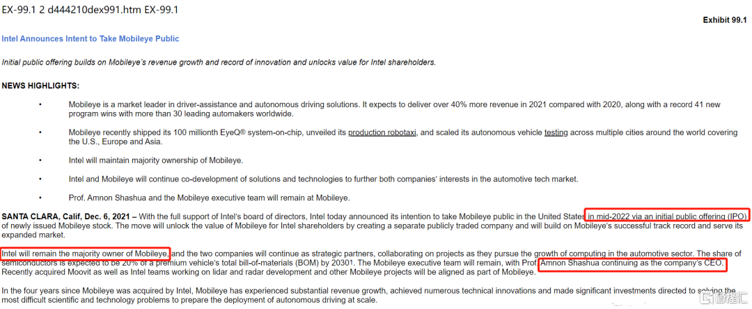 近日,英特尔发布公告称,其计划于2022年年中将旗下自动驾驶子公司Mobileye以IPO方式在美上市,估值达到500亿美元,一时间在业内引起轩然大波。