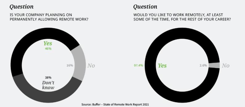 是谁预测到这种趋势的?Forrester曾表示:“混合工作模式将成为信息工作者的标准模式”;Blue Frontier还曾预测称,“大多数公司将采用混合工作模式,办公室人员更少,全职远程员工更多。”
