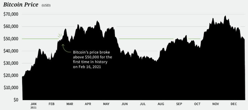 年初至今,比特币涨幅大约为72%,目前基本交易与50000美元上方,在今年11月最高达到69000美元。当然,比特币价格在今年并不是稳稳上升,过程也充满波折,至少经历了3次30%的回撤,在5月一度经历50%的回调。
