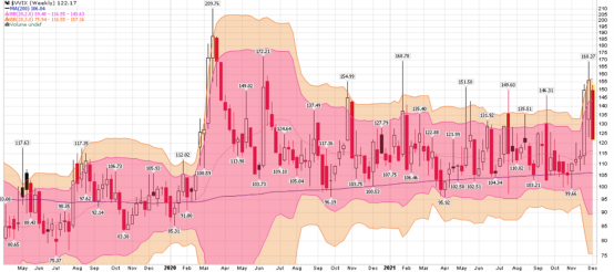 不确定性浪潮席卷华尔街,推动恐慌指数VIX的上涨。自2020年3月市场大幅回调以来,VIX的波动率VVIX的200周移动平均线缓慢爬升。另外,分别以2个标准差和3个标准得出的布林带区域(粉红色和橙色)在过去几周的时间里急剧扩大。