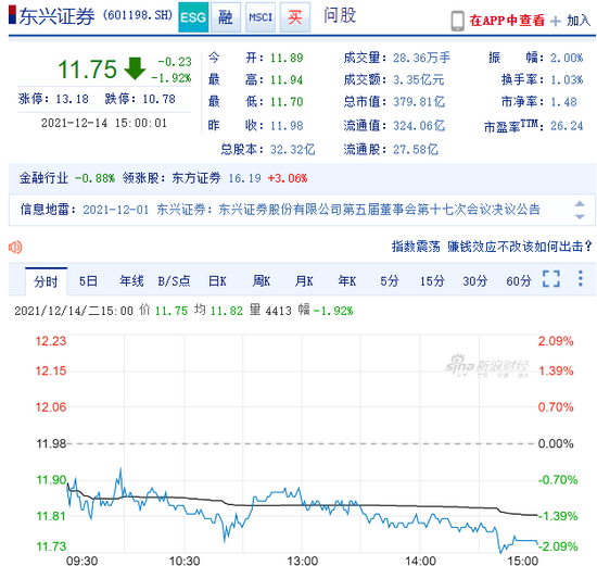 截至今日收盘,东兴证券股价跌1.92%,报11.75元,最新总市值为379.81亿元。