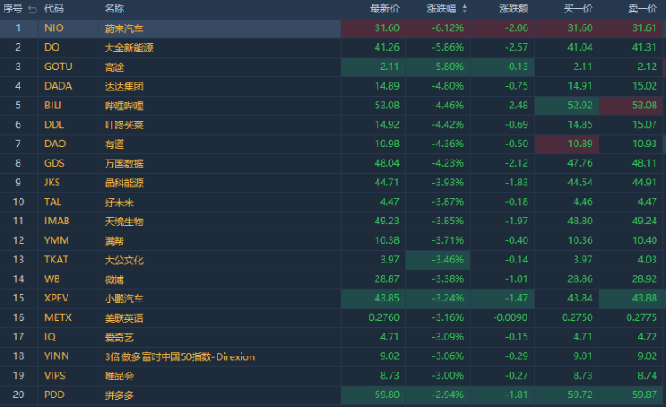 截至发稿,蔚来汽车 $NIO 跌超6%,大全新能源 $DQ 、高途 $GOTU 跌超5%,达达集团 $DADA 、哔哩哔哩 $BILI 、叮咚买菜 $DDL 、有道 $DAO 等跌超4%,好未来 $TAL 、小鹏汽车 $XPEV 、爱奇艺 $IQ 、唯品会 $VIPS 等跌超3%,拼多多 $PDD 跌超2%。
