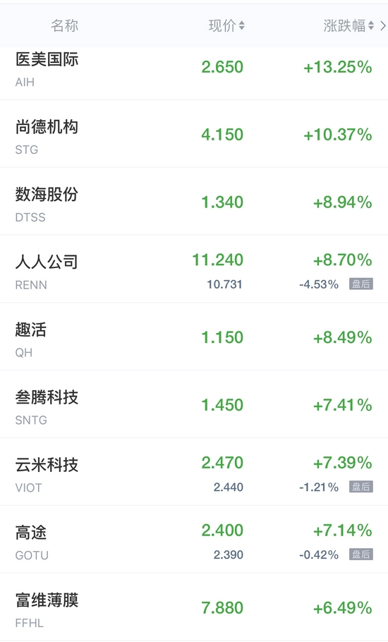 亿邦国际涨超20%,尚德机构涨超10%,人人公司、趣活涨超8%,云米科技、高途涨超7%,云集涨近5%,阿里巴巴涨超3%,贝壳、箩筐技术、怪兽充电、极光涨超2%,欢聚集团涨超1%,迅雷涨近1%。