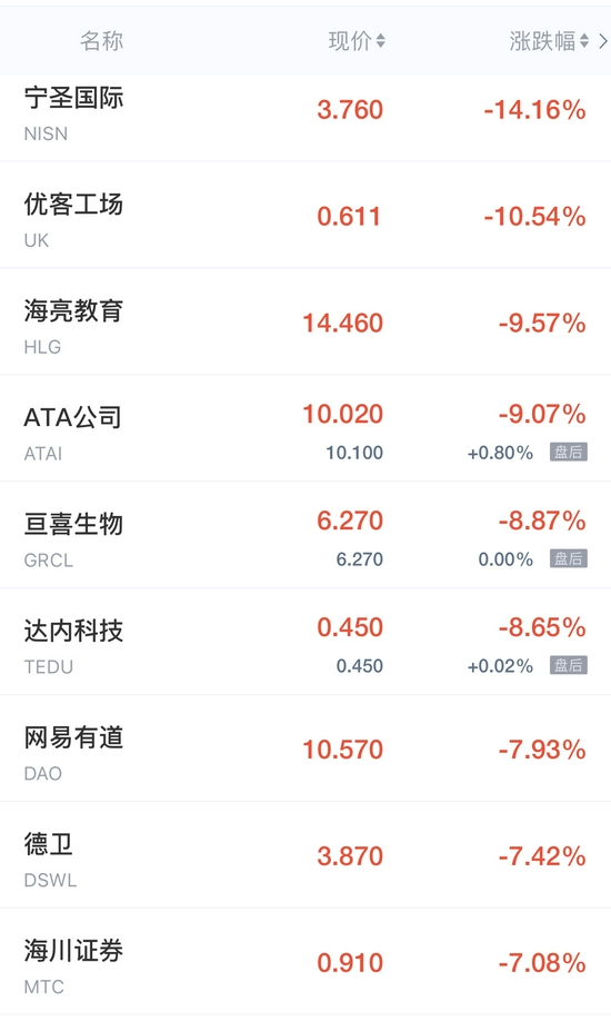 优客工场跌超10%,网易有道跌近8%,海川证券跌超7%,猎豹移动跌超6%,趣头条跌近6%,瑞幸粉单跌超5%,哔哩哔哩、中网载线跌超4%,爱奇艺、36氪跌超3%,房天下跌近3%,前程无忧、知乎、HM>汽车之家、凤凰新媒体、微美全息、第九城市、雾芯科技跌超2%,虎牙、搜狐跌近2%,百度、唯品会、叮咚买菜、嘉楠科技跌超1%。