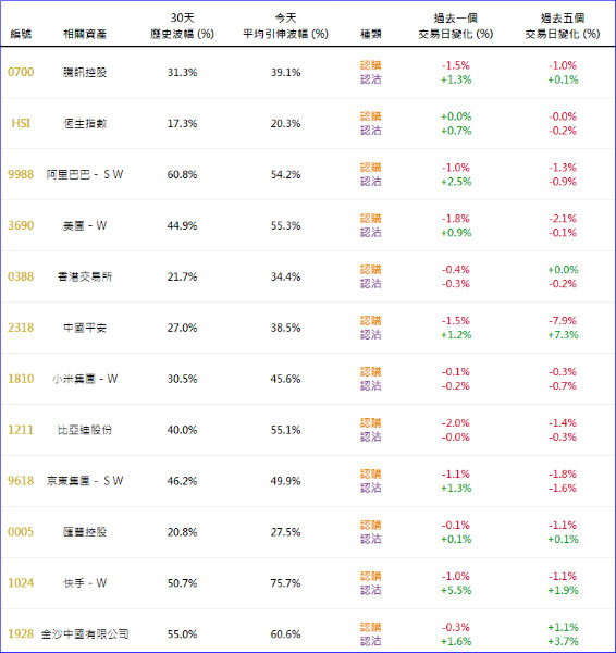 周二恒指相关权证的平均引伸波幅报约20.3%,按日变动不大。个股方面,腾讯控股、阿里巴巴、美团、中国平安、比亚迪股份、京东集团等相关认购证的引伸波幅均按日下降;腾讯、阿里、平安、京东、快手、金沙中国等相关认沽证的引伸波幅则按日上升。