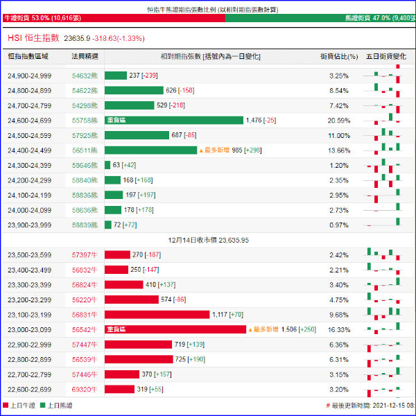 街货分布方面,至周二,恒指牛证街货在收回价23000点至23600点之间,相当约4127张期指合约;恒指熊证街货重货区相对偏离现价,在收回价24400点至24900点之间累计相当约4303张期指合约。