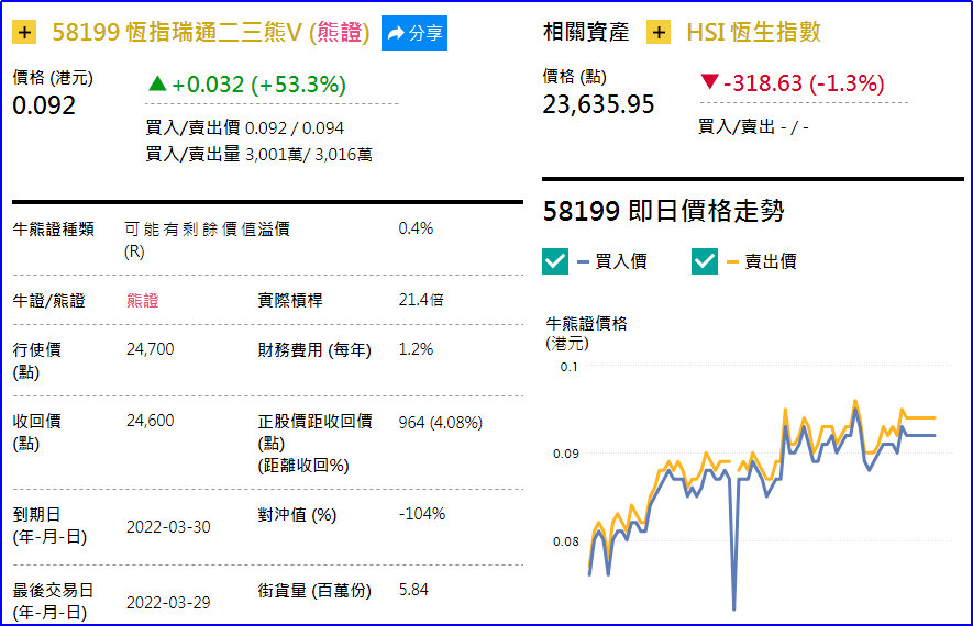 1、强势轮证:恒指瑞通二三熊(58199.HK),周二大涨53.33%;