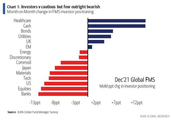 美银年内最后一次基金经理调查显示,由于疫情风险,加之诸多央行将召开货币政策会议,全球基金经理囤积了大量现金,市场预期美联储将采取更为激进的货币政策,这促使投资者采取更为防御性的资产配置策略。