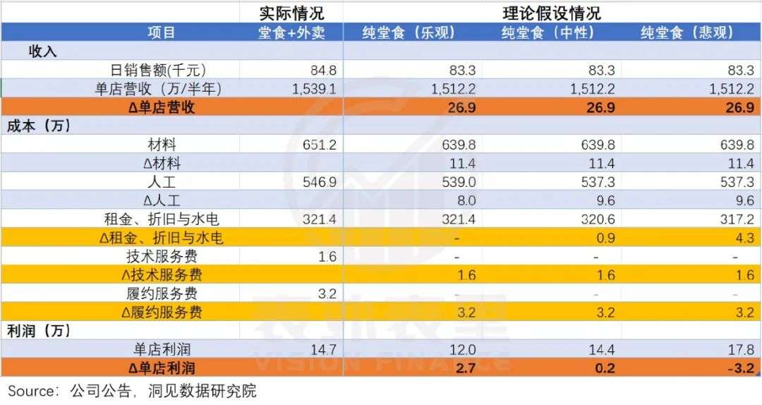 (1)纯堂食只有收入数据,其成本变动需要根据外卖成本参数假设不同,进行推演。