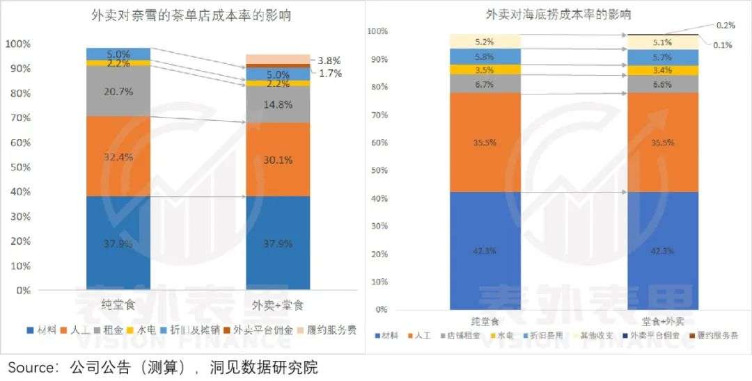 基于此,这里分别以奈雪的茶以及海底捞为模型,对比纯堂食和“外卖+堂食”两种模式,花钱效率如何。