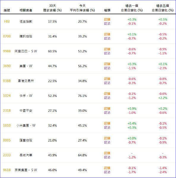 周三恒指相关权证的平均引伸波幅报约20.7%,按日有所调升。个股方面,腾讯控股、阿里巴巴、美团、快手、中国平安、长城汽车、京东集团相关认沽证的引伸波幅按日有明显下降;腾讯、美团、平安、小米相关认购证的引伸波幅按日有所上升。