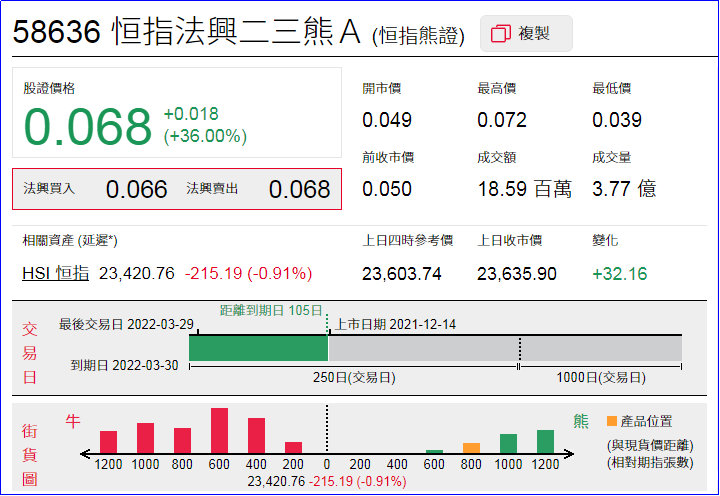 1、强势轮证:恒指法兴二三熊(58636.HK),周三大涨36.00%;