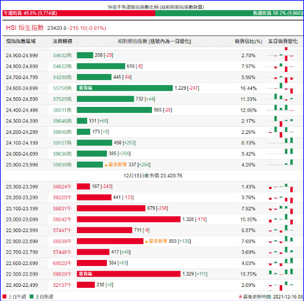 街货分布方面,至周三,恒指牛证街货在收回价22800点至23400点之间,相当约4381张期指合约;恒指熊证街货在收回价23900点至24700点之间,相当约4402张期指合约。